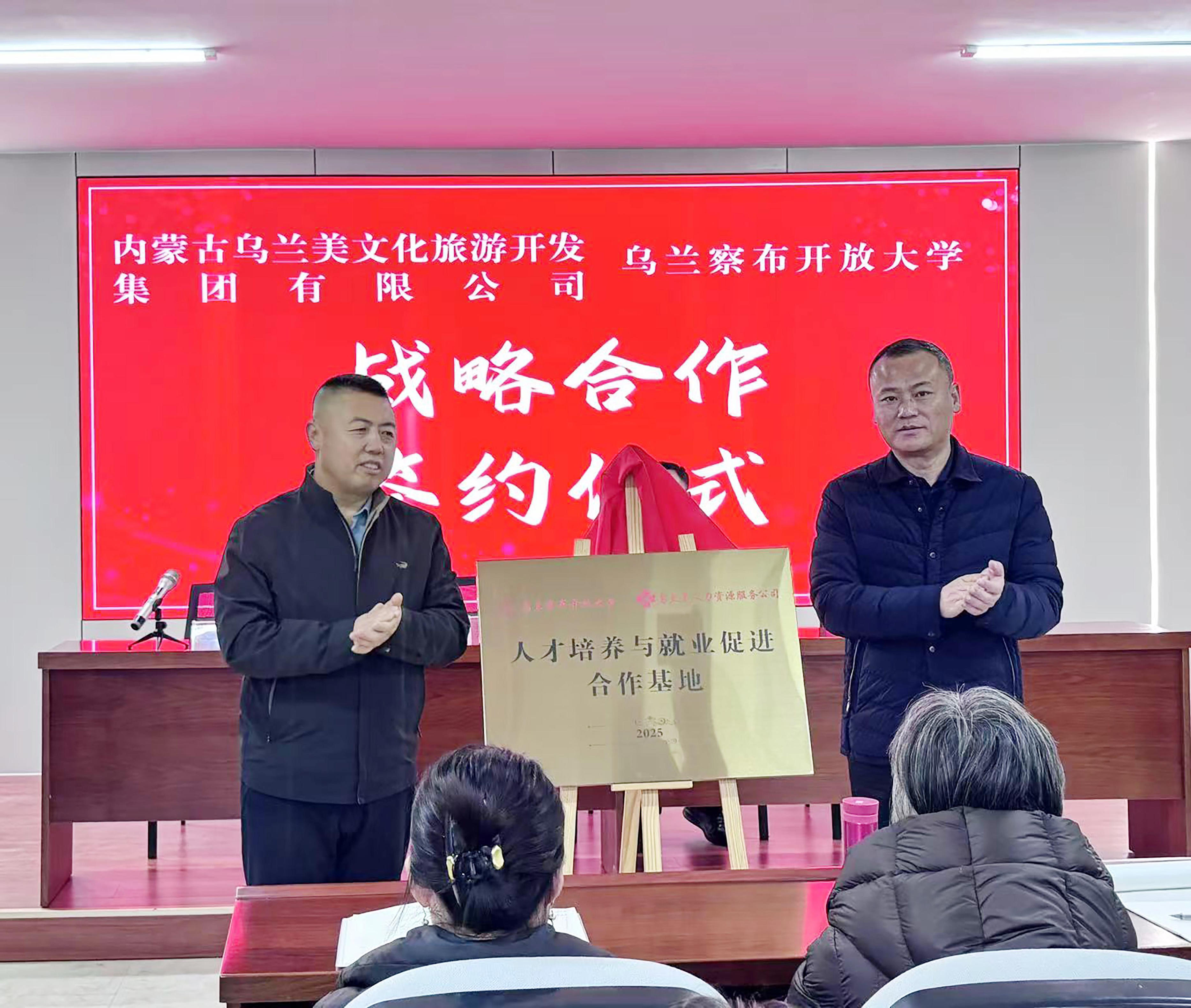仪式现场,乌兰察布开放大学党委副书记、校长王杨与内蒙古乌兰美文化旅游开发集团有限公司董事长窦陶然共同签署战略合作协议,并为“家政技能实训基地”“人才培养与就业促进合作基地”揭牌。两大基地的成立,将实现“教学-实训-就业”闭环,为待就业人群搭建从技能学习到岗位输出的一站式平台。