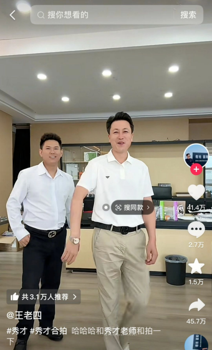 有的则采取更为隐蔽的“借壳回归”策略,如“秀才”与“王老四”账号的互动。近期,有网友发现“王老四”账号发布多条与“秀才”的合拍视频,“秀才”以标志性形象出镜(乡村风西装、挑眉撩发、对口型演唱),配文标注“和秀才老师合拍”及“秀才”标签。