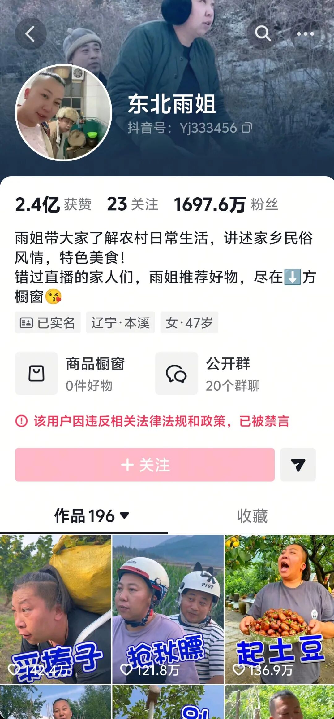 但这位“中老年妇女收割机”却因涉嫌违法违规(含税收相关监管问题)被举报,账号最终被永久封禁。