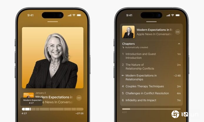 Podcasts应用程序加入自动生成章节功能,方便用户浏览节目内容。添加连接功能让用户直接从播放界面和文本记录中,查看并关注节目中提及的其他Podcast。