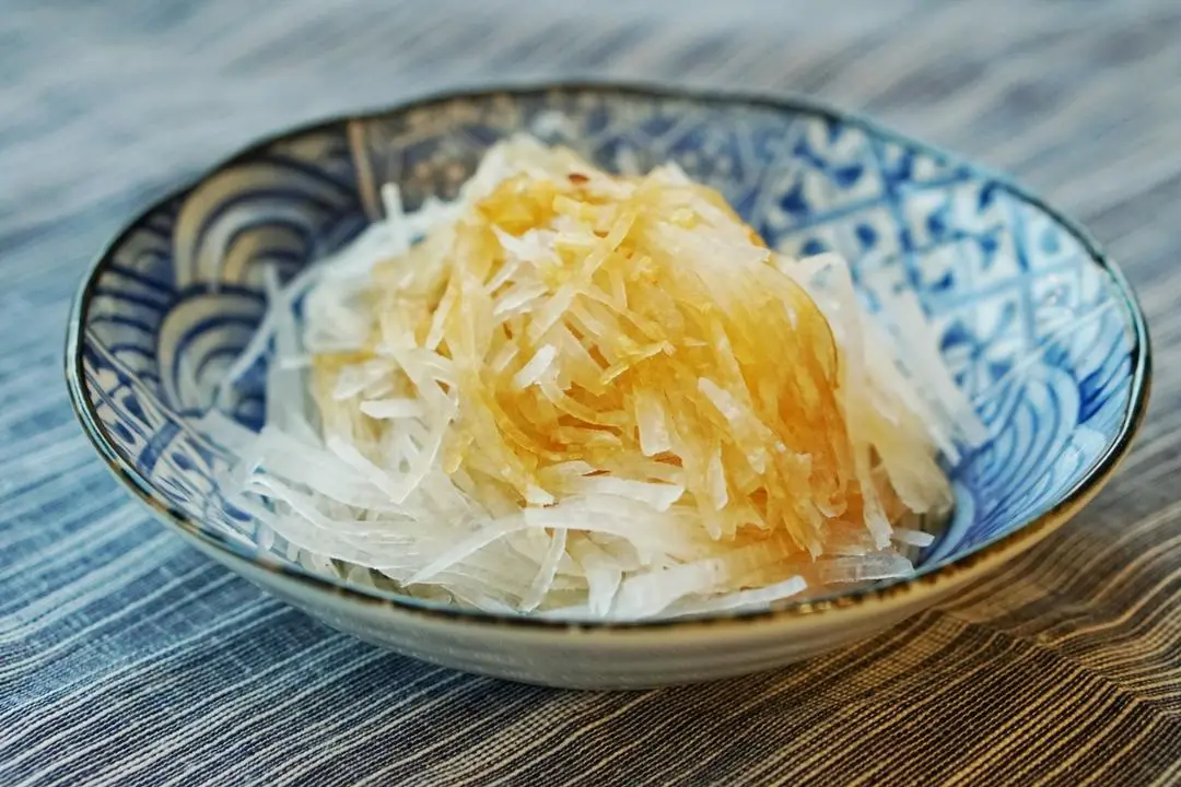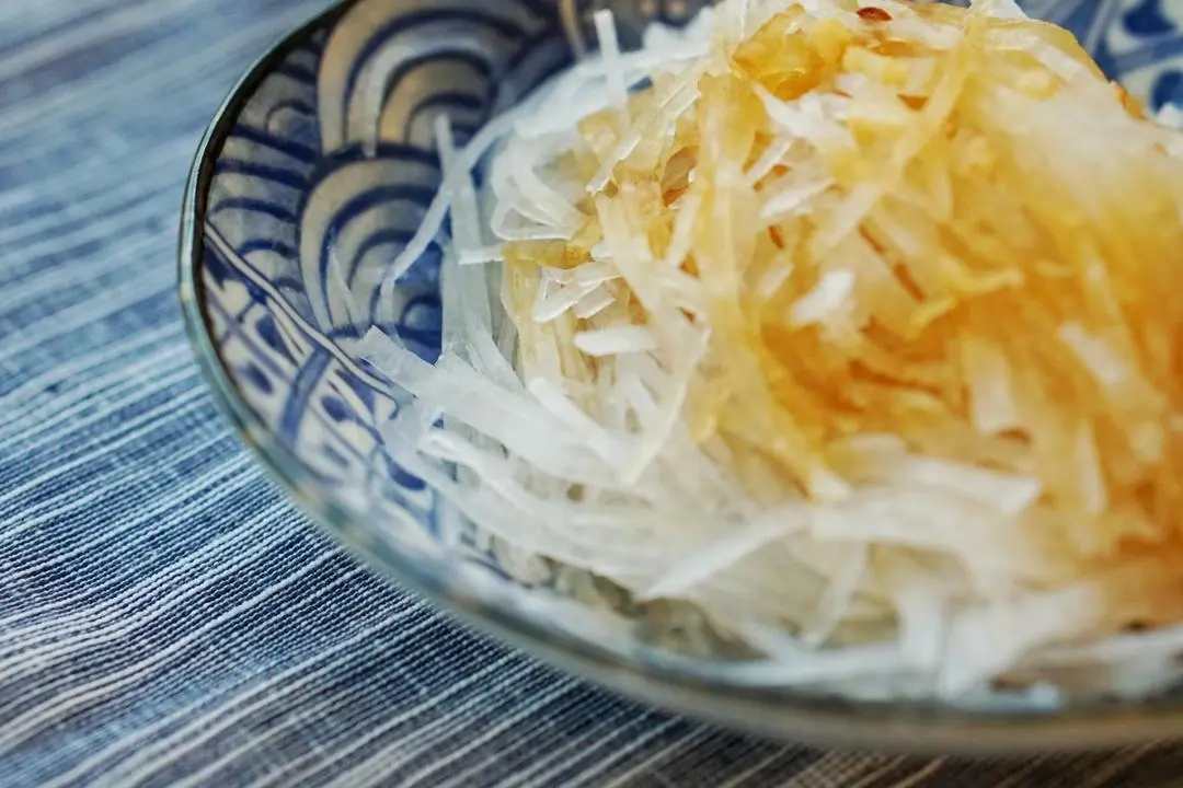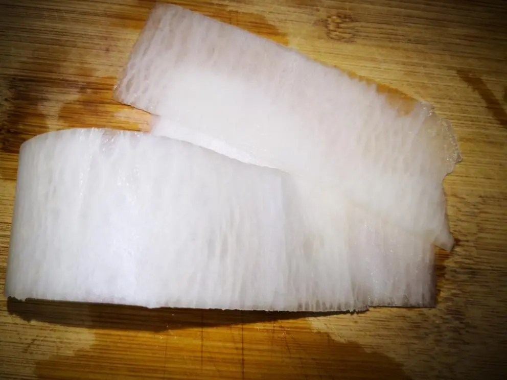步骤二:薄片再切成丝1~2mm宽度的细丝,每根萝卜丝都纤细透明很漂亮。
