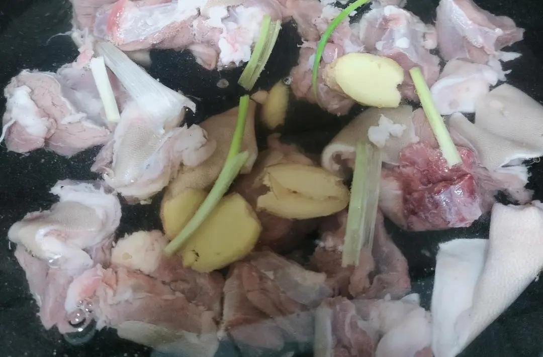 步骤一:羊肉冷水下锅,加姜、葱、料酒(有白酒更好),焯水。热水冲洗干净。