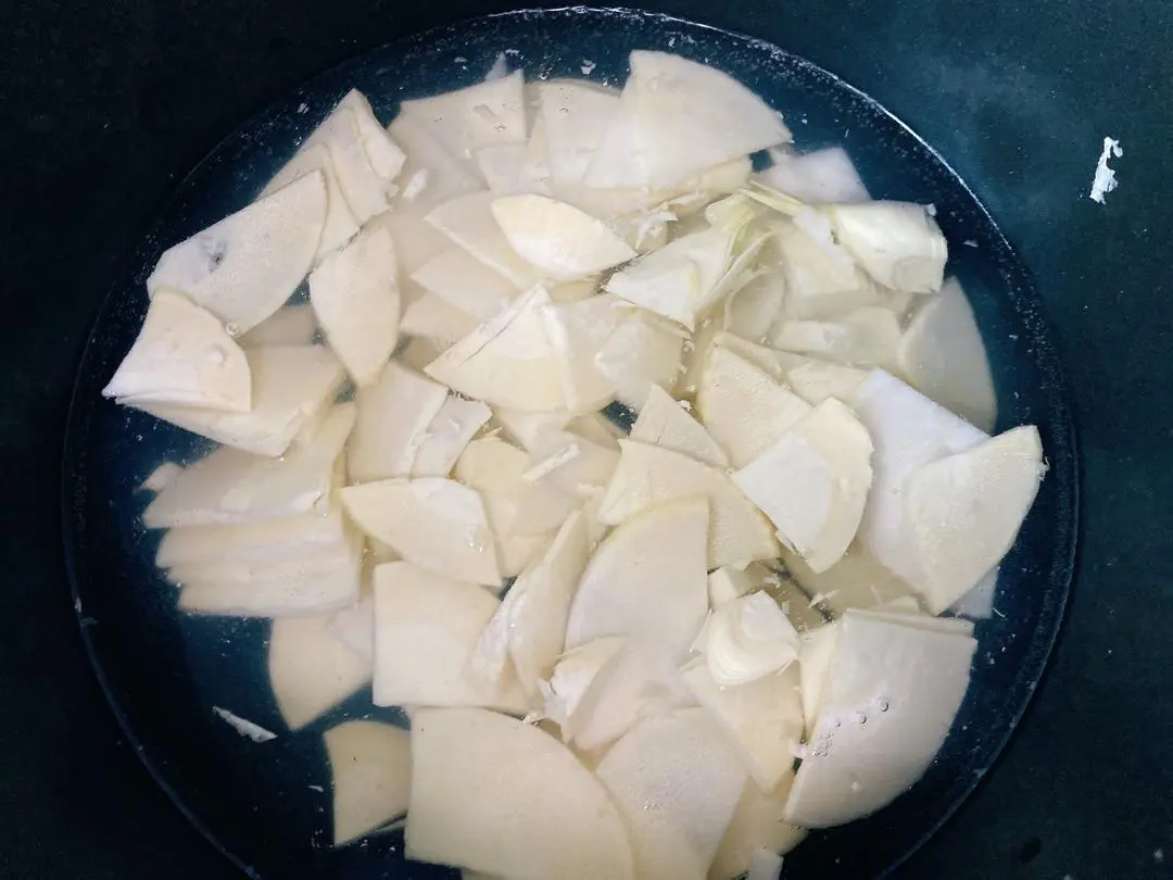 步骤三:冬笋去皮切片焯水(冷水下锅煮至沸腾)。