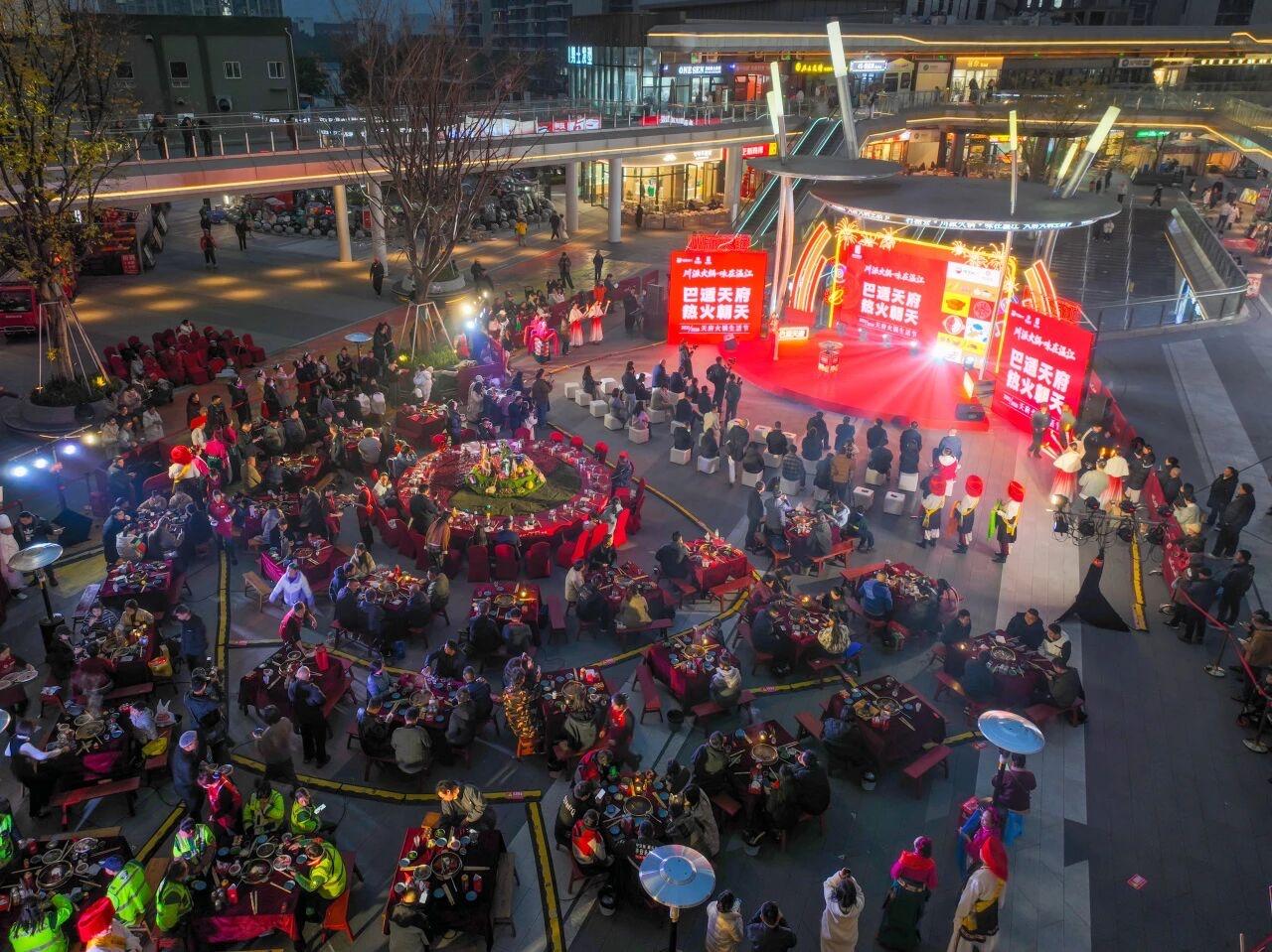 活动现场,40口大锅一字排开,鲜红的辣椒、醇厚的牛油在锅中翻腾,麻辣鲜香的气息扑鼻而来。在人们围坐畅谈的欢声笑语中,全民火锅宴开席,在冬日的夜空下,交织成一片“热火朝天”的人间烟火。