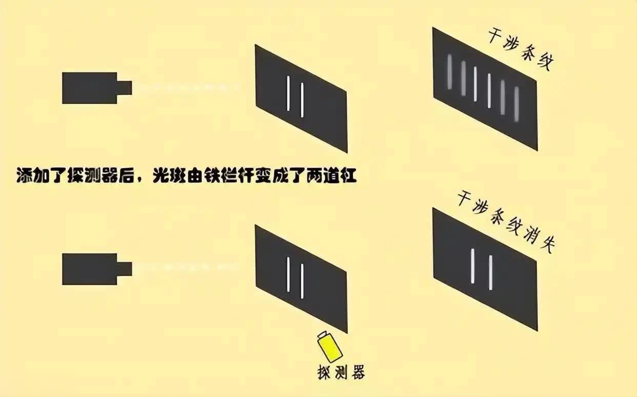 更令人匪夷所思的是,如果在双缝后安装探测器,试图观察单个电子究竟穿过了哪条缝,干涉条纹会立刻消失,探测屏上只会出现两个亮斑;而一旦移除探测器,干涉条纹又会重新出现。这意味着,电子的行为取决于是否被 “观测”:当没有观测时,电子仿佛同时穿过了两条缝,以 “波” 的形式产生干涉;当被观测时,电子则表现出 “粒子” 的特性,只选择一条缝穿过。