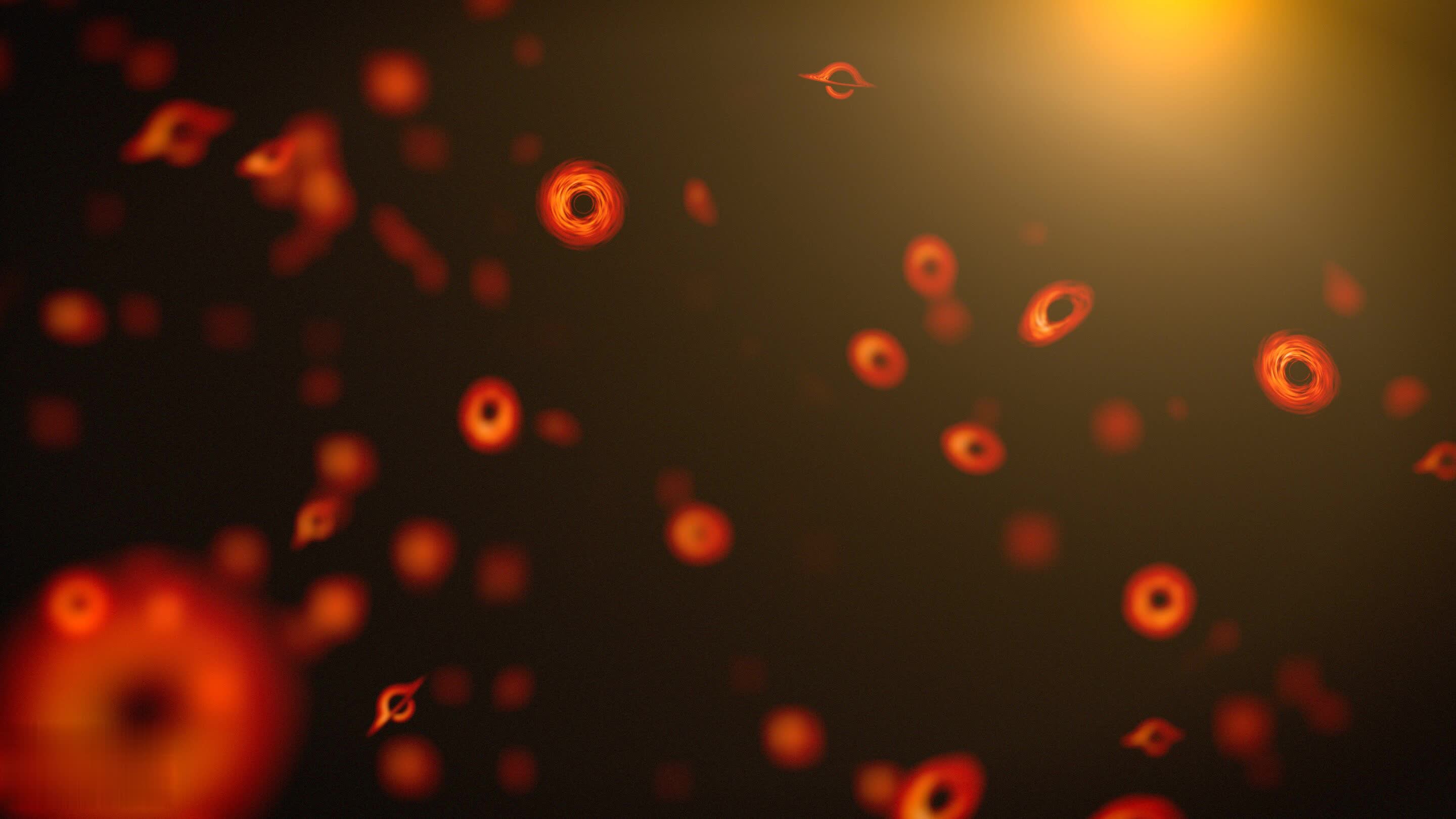 这位艺术家的概念采用了一种奇特的方法来想象小的原始黑洞。实际上,如此微小的黑洞很难形成吸积盘,使它们在这里可见。