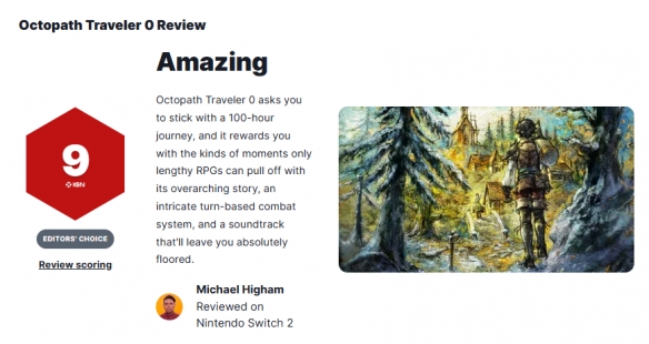 日式角色扮演游戏《八方旅人0》已于12月4日正式发售,经过数周的体验,IGN终于在今日发布了游戏的评测文章,并打出9分的高分成绩。