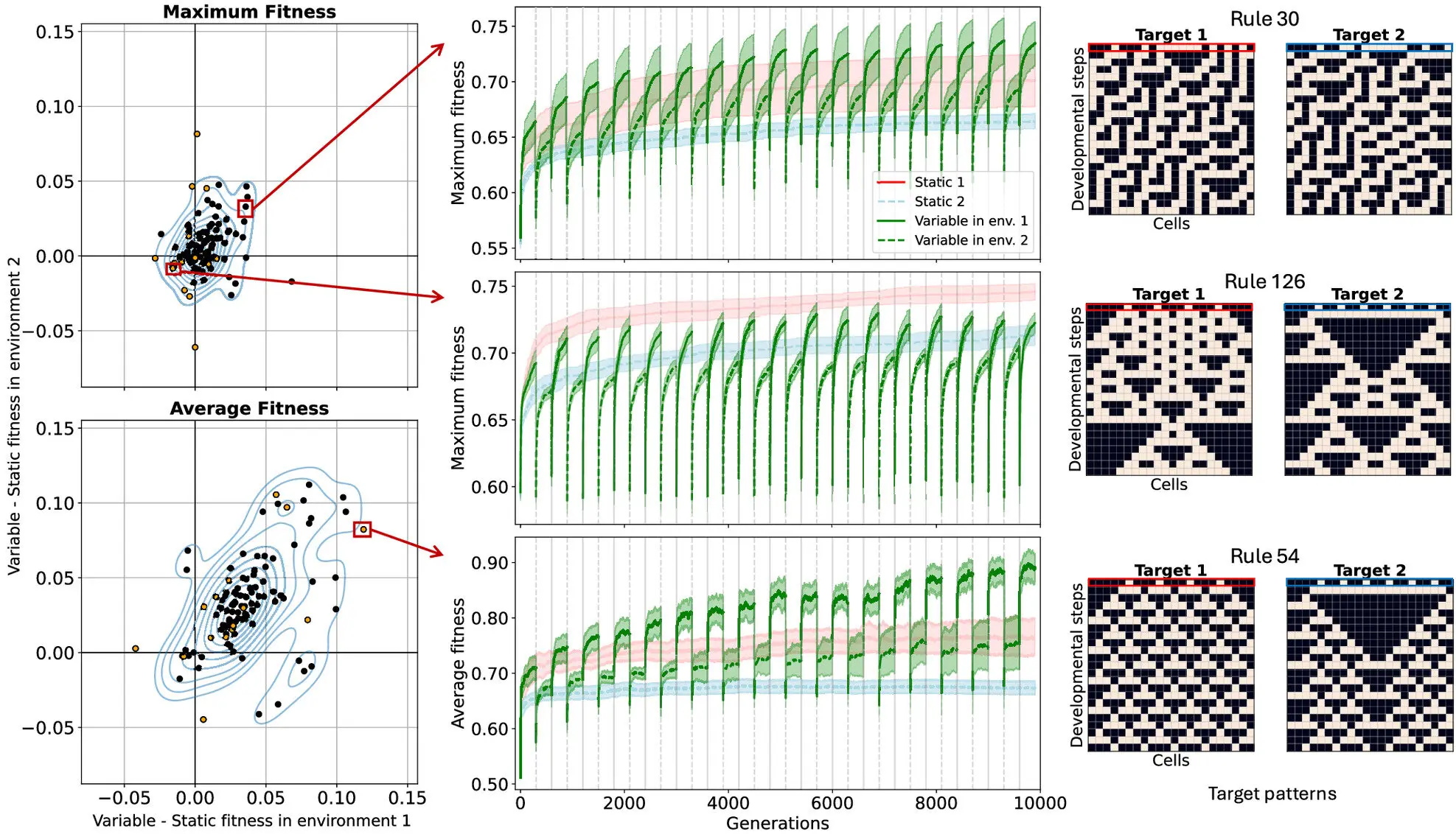 他们构建人工数字生物,将其置于105种模拟动态环境中,这些环境涵盖自然界常见的交替条件,从温度的冷热循环到降水的干湿交替,几乎覆盖了地球生物可能面临的主要环境波动类型。