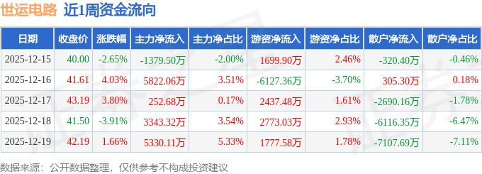 本周盘点(12.15-12.19):世运电路周涨2.68%,主力资金合计净流入1.34亿元