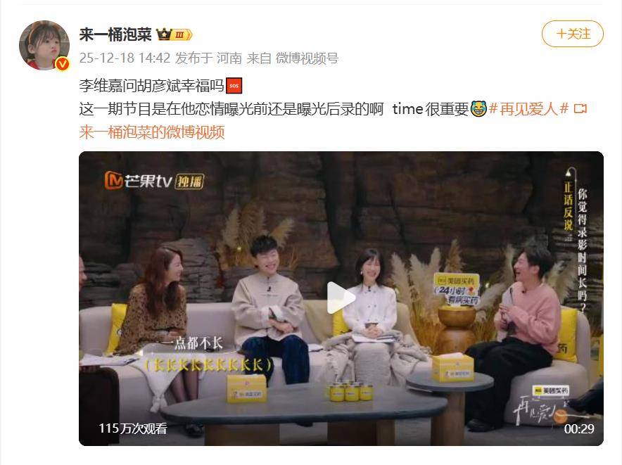 在《再见爱人》的节目中,面对李维嘉的“灵魂拷问”,胡彦斌展现高情商,并未直接提及私人感情,而是巧妙回应:“每一次来录《再见爱人》我都很幸福。”此言一出,立刻引发现场嘉宾起哄。网友普遍认为,这分明是节目组在其11月21日恋情曝光后的一次善意调侃,而胡彦斌那回避正面答案却全程笑容满面的状态,早已被观众盖章认定:这分明是“默认幸福”。
