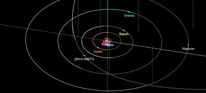 目前2014 UN271彗星位于距太阳约22个天文单位的地方,也就是说它与太阳的距离已经比海王星轨道还近,接近天王星的轨道距离了,而且它正在以每年一个天文单位的速度向着以太阳为中心的内太阳系飞奔,秒速5公里左右,预估到2031年,它将来到土星的轨道附近。