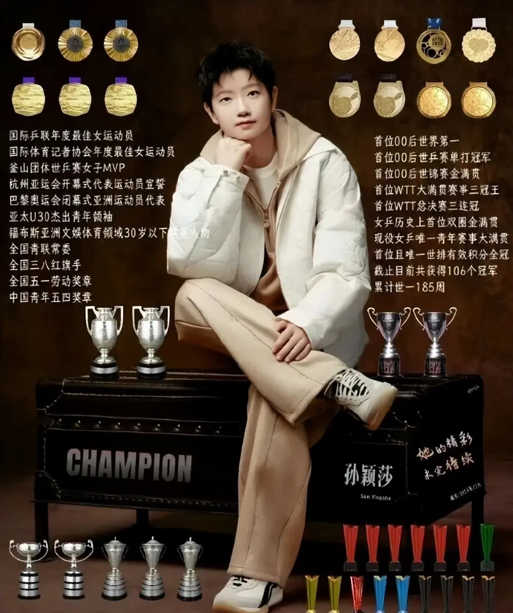 连续179周世界排名第一,女子乒坛首位世乒赛双圈金满贯,全年世界大赛单打“全包圆”,再加上那12座沉甸甸的WTT 1000+级别单打奖杯。