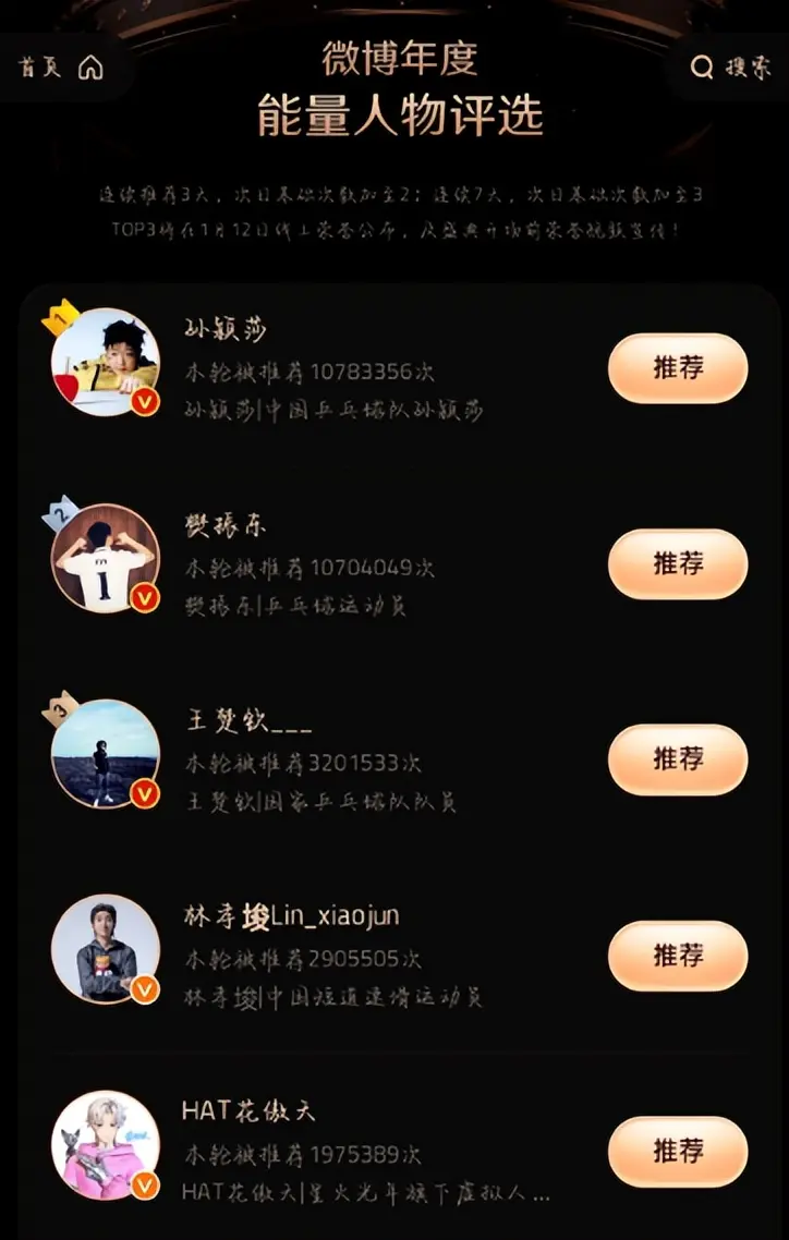 2025年微博年度能量人物评选进入白热化。 孙颖莎和樊振东突破1000万推荐值,断层领先! 看到这个数字时,我并不惊讶。 这1000多万张票,不是粉丝刷出来的流量,而是人心投出来的“信任状”。 看着这两位国乒“双子