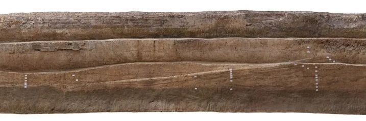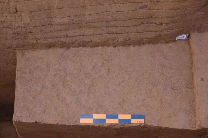 在发掘探沟北段,清理发现在硬面2下的夯土夯筑中,在同一夯层内存在东西两侧明显不同的、呈南北一线的土色和夯窝分布差异,揭示该“线”两侧应存在东西两个“施工队”,分从东西两侧向“线”所在相向施工。一方面因两队用土来源不同造成夯筑用土的颜色存在明显差异,一方面因两队夯打顺序有异造成夯窝分布不同,形成南北一线的同层夯土内土色、夯窝分布的迥异情况,留下难得的秦大型国家工程营造管理的重要迹象。