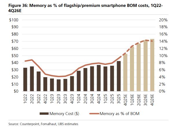 但对于那些主打性价比的中低端手机来说,情况就完全是另一番景象了。瑞银的分析显示,到 2026 年第四季度,内存成本在中低端手机总成本中的占比将飙升到惊人的 34%。这意味着,你买这部手机的三分之一钱,都是花在了那一小块存储芯片上。