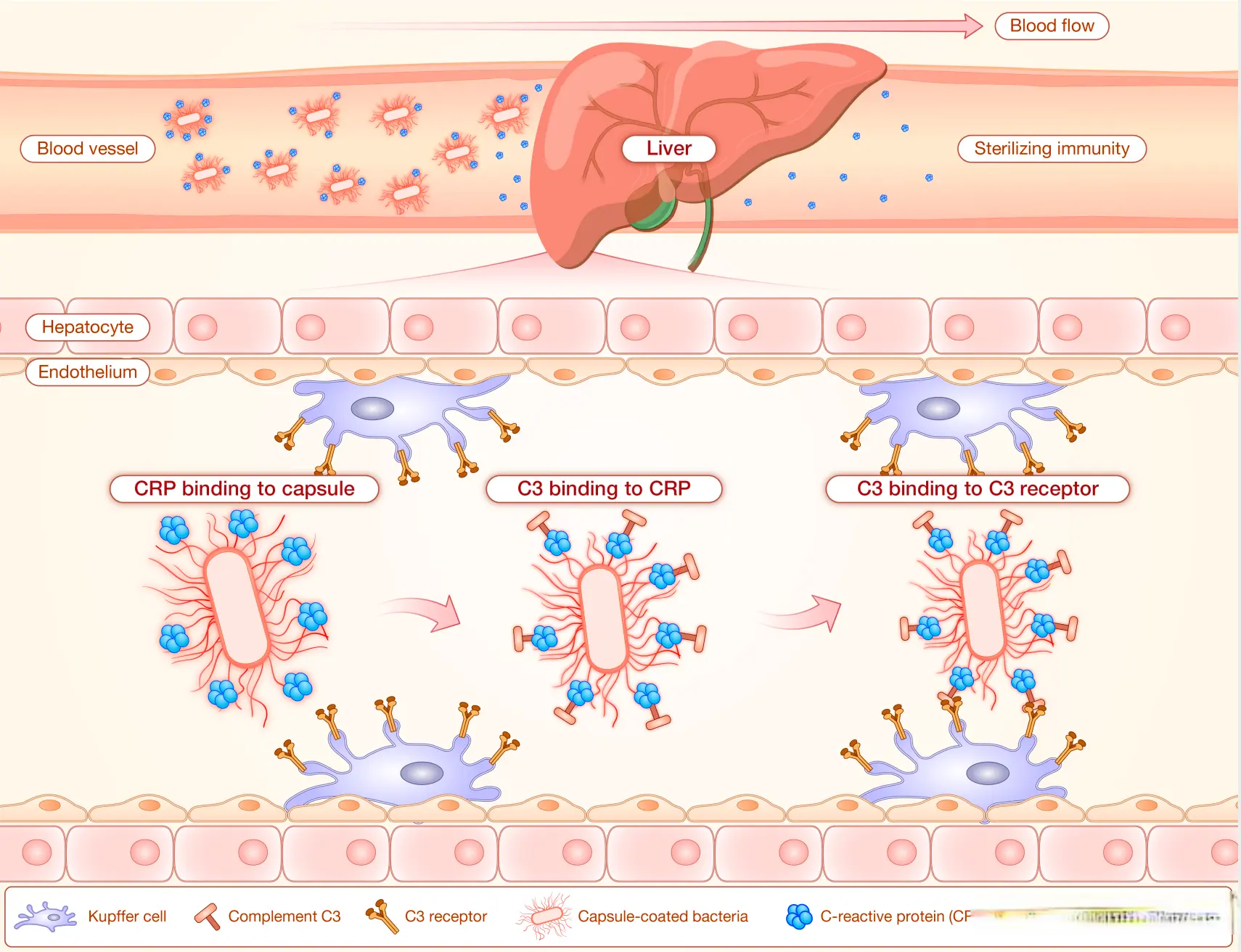 图2.C反应蛋白帮助肝脏捕获血流细菌示意图