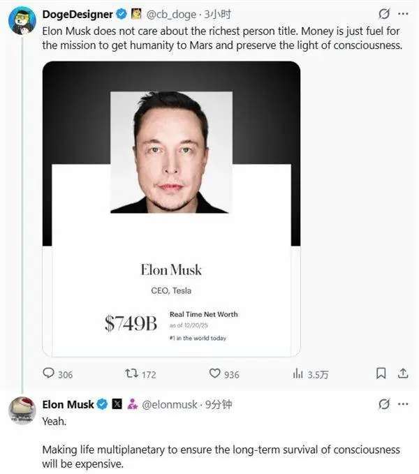 快科技12月21日消息,有网友在社交媒体上表示:“埃隆马斯克并不在意世界首富的称号,财富对他来说只是推动使命的燃料——他的使命是让人类登陆火星,延续文明的火种。” 对此,马斯克评论称:“的确如此,要实