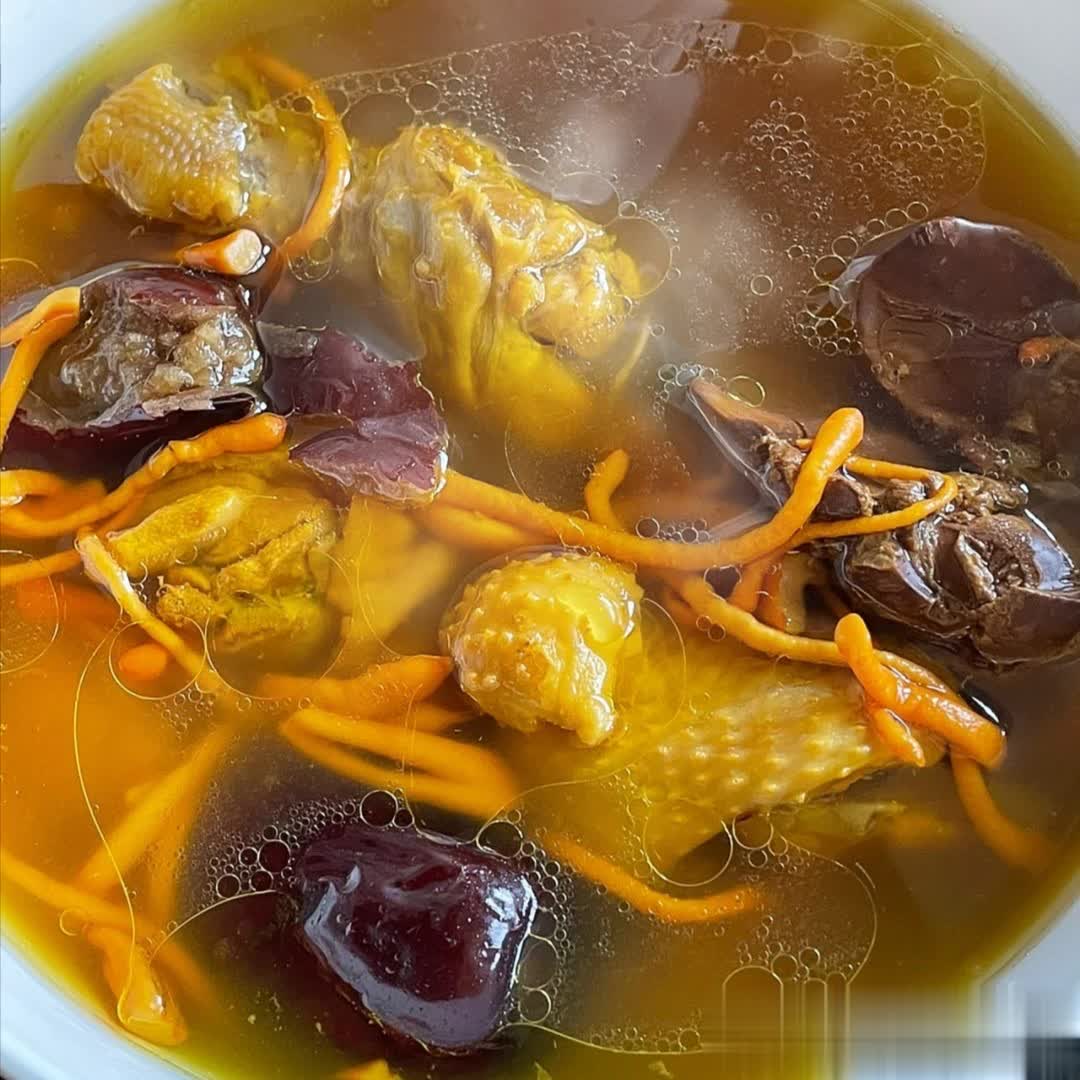 食材准备:鸡肉,虫草花,猴头菇,香菇,羊肚菌,人参,姜片,红枣。