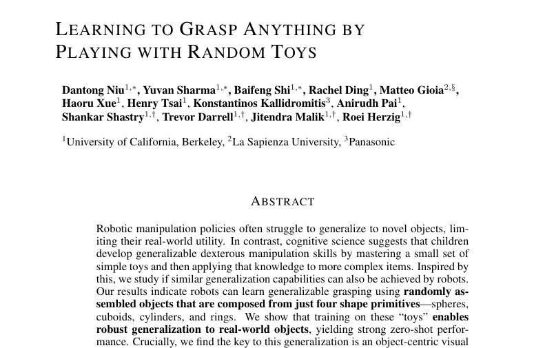 加州大学伯克利分校的一个研究团队,包括Dantong Niu、Yuvan Sharma、Baifeng Shi、Rachel Ding、Matteo Gioia、Haoru Xue、Henry Tsai、Konstantinos Kallidromitis、Anirudh Pai、Shankar Shastry、Trevor Darrell、Jitendra Malik和Roei Herzig等研究者,决定用这个简单的观察来解决机器人领域一个长期存在的难题。他们的研究成果发表在2025年10月,论文编号为arXiv:2510.12866v1。这项研究提出了一个名为LEGO的框架,其核心思想是:机器人也可以通过在简单玩具上的训练,学会抓取真实世界中的各种物体。