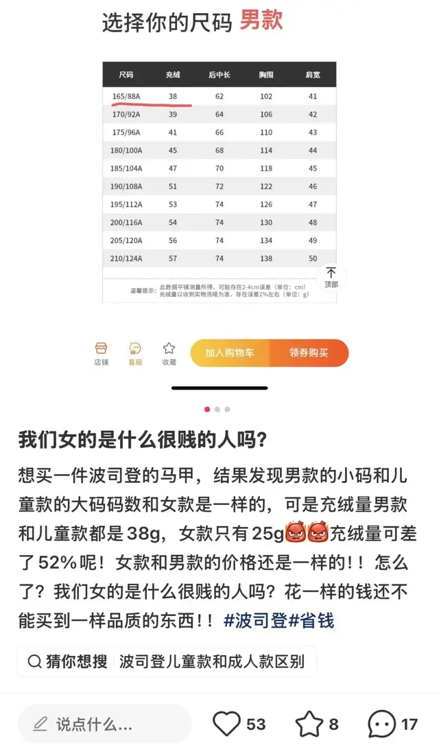 她将同品牌一款短款羽绒服的男女款详情页并列打开,屏幕上的数字让她惊讶:女款最大码,充绒量标注为120克;而男款最小码,充绒量却达到了195克。更令人费解的是,用料多出60%以上的男款,价格反而便宜了几十元。
