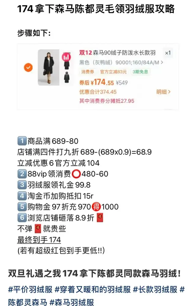 熹熹的经验远不止“买男装”这一条,她掌握着一套不被大众熟知的“性价比密码”。她关注微博上那些专门发布优惠信息的博主,还加入各种粉丝群,就为了从中获取品牌官方店的优惠券信息;她研究平台大促的规则,掐着时间抢券、凑满减、充值购物金。通过这套方法,她以228元的价格拿下了一件森马的长款羽绒服(日常价459元),而群里更有厉害的姐妹只花了174元。