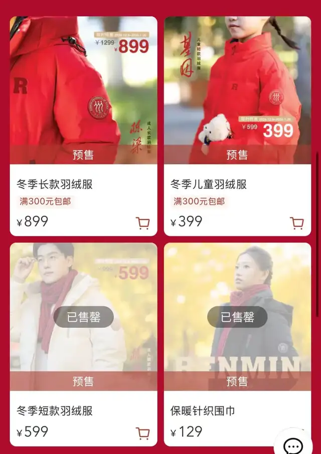 还有一批年轻人开始转向高校羽绒服。今年冬天,中国人民大学一款“书记严选”的“人大红”羽绒服上线后,有几款迅速断码,官方小程序因访问量过大而一度瘫痪,价格看起来不输平价品牌,优惠后长款899元、短款399元、童款200元。