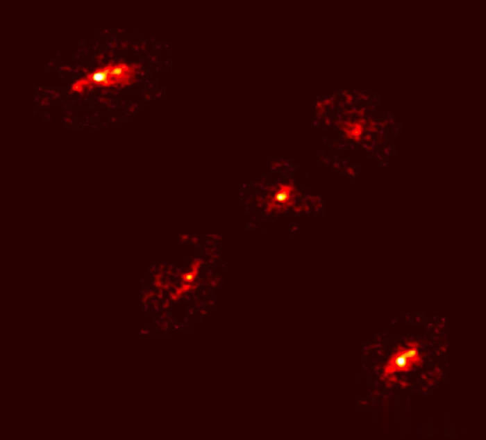 根据一项发表在《天体物理学杂志》上的新研究,科学家利用位于阿尔卑斯山的“北部扩展毫米波射电望远镜阵列”(NOEMA),以及位于阿塔卡马沙漠的“阿塔卡马大型毫米/亚毫米波阵列”(ALMA),在大约117亿光年外,发现了五个看上去一模一样的星系(如下图所示)。