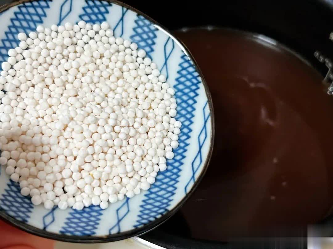 4、电饭锅启用“蒸煮”功能,保持锅内水沸腾,加入西米,搅拌均匀,防止西米粘连;