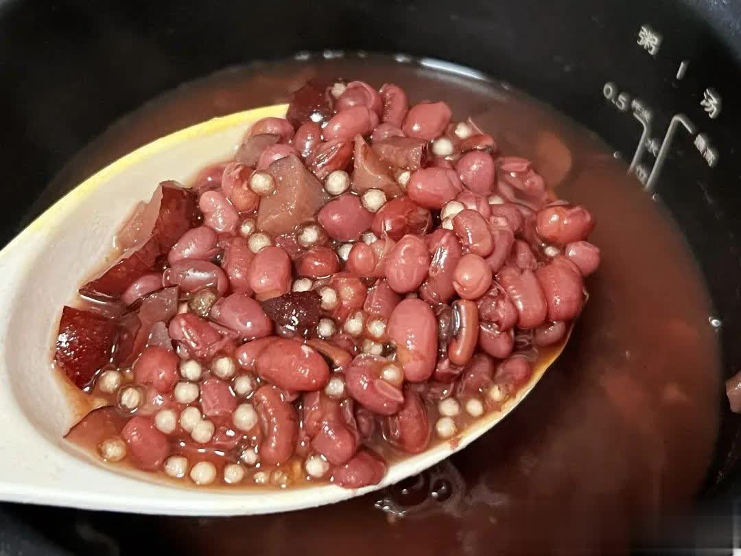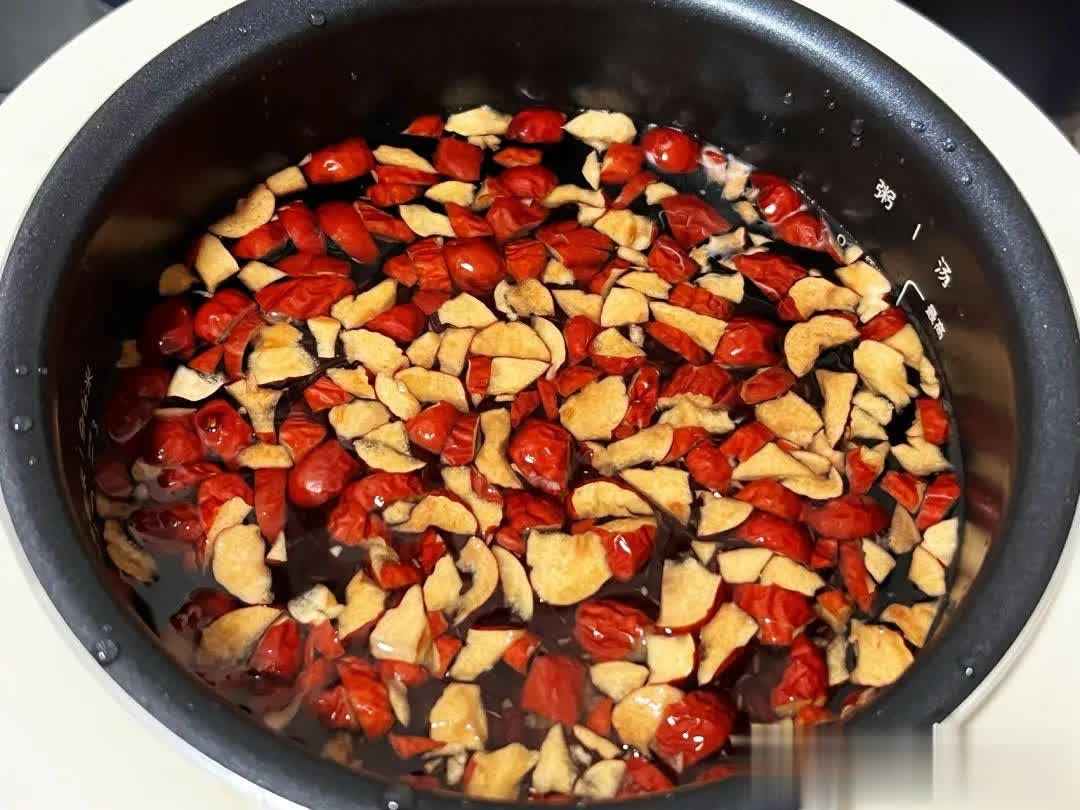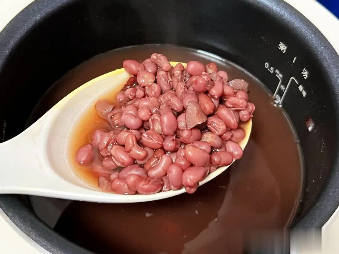 2、将红豆、红枣、冰糖放到电饭锅里,加入足量的清水,设置煲汤或煮粥功能,一般是90分钟。红豆没有提前泡,水量则需要多一些,如果提前泡过红豆,水量可以稍微少一点,自行调整。