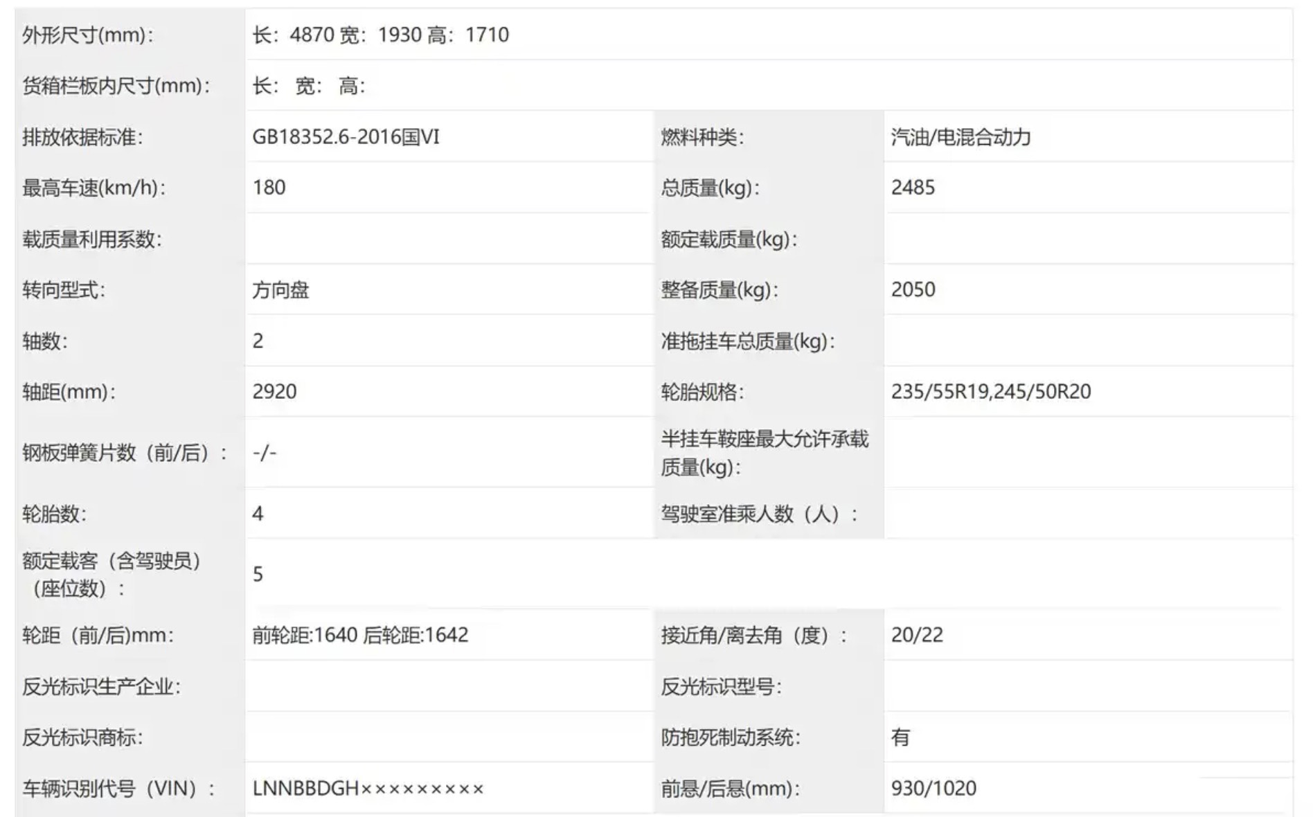 据申报信息显示,新车的车身尺寸长宽高分别为4870/1930/1710毫米,轴距2920毫米,车内为5座布局,官方定位于中型SUV。车身侧面线条舒展流畅,车顶以轻微溜背造型营造动感姿态,搭配多辐式大尺寸轮毂,运动气息扑面而来。结合申报信息显示的车身比例,新车轴距经过优化调校,配合大五座布局,将为车内乘客带来充裕的乘坐空间。车尾部分,贯穿式LED尾灯契合当下主流设计趋势,尾灯中部带有辅助驾驶小蓝灯,细节处尽显精致质感。