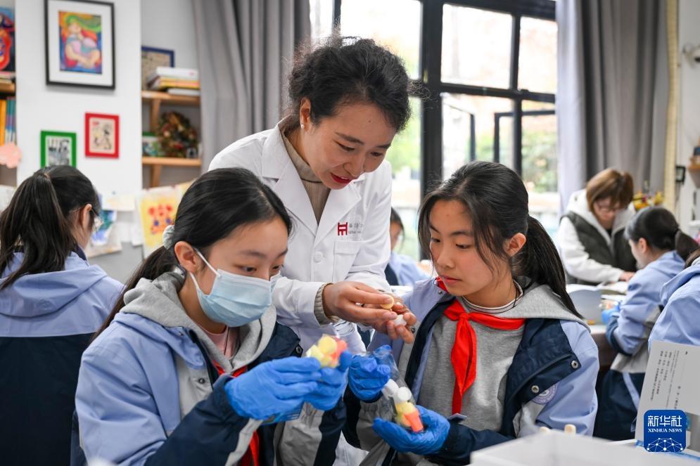 12月22日,上海市第三女子初级中学学生在活动现场体验青铜器修复技艺。