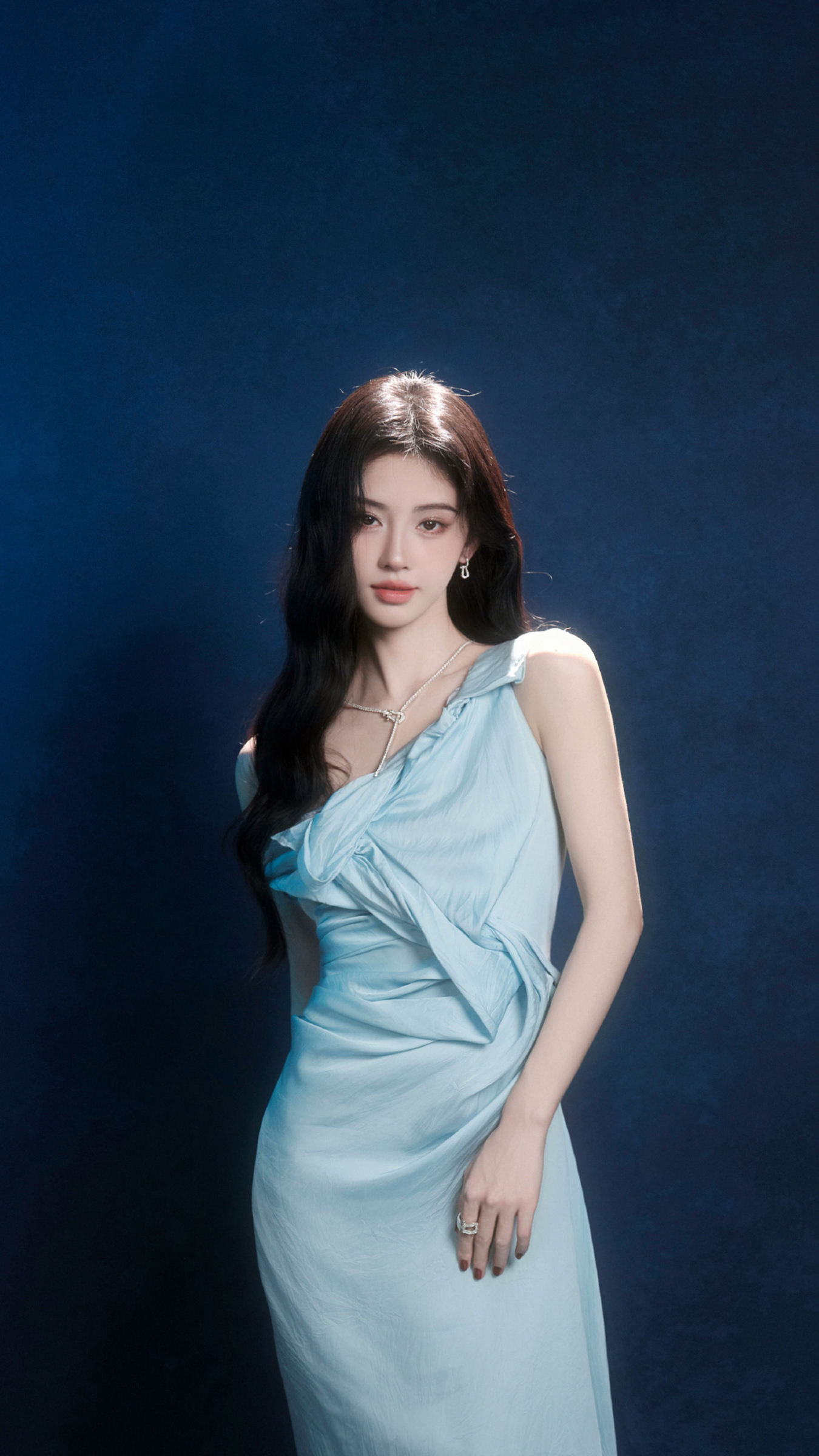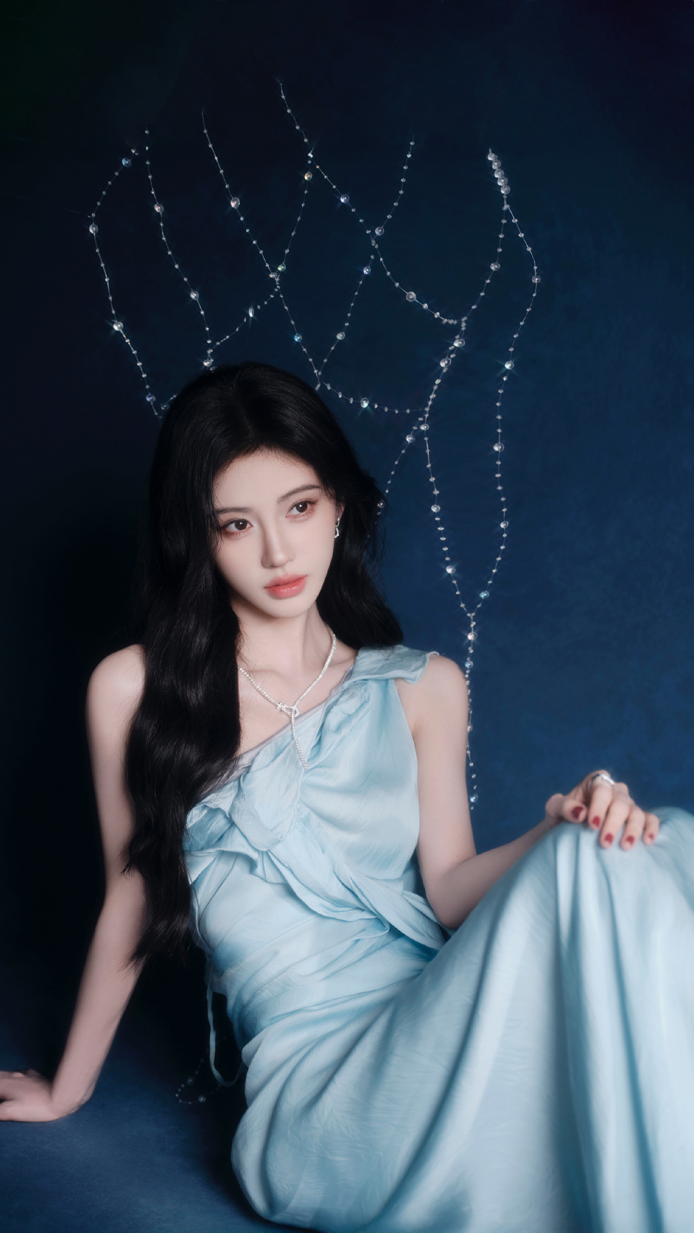 姐妹们,快扶我一下,我好像被一道来自银河系的蓝光击中了!没错,说的就是鞠婧祎——这位行走的人间仙女,最近又用一套冰蓝色斜肩长裙把全网审美拉到了外太空。那裙子仿佛是从极光里裁下来的,自带柔光滤镜