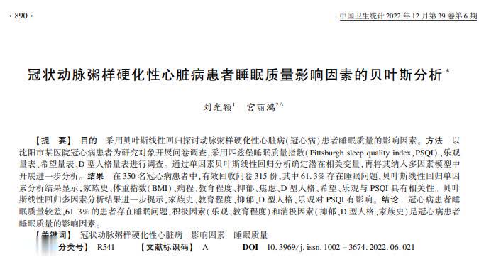 [1] 刘光颖.冠状动脉粥样硬化性心脏病患者睡眠质量影响因素的贝叶斯分析,中国卫生统计, 2022-12-25
