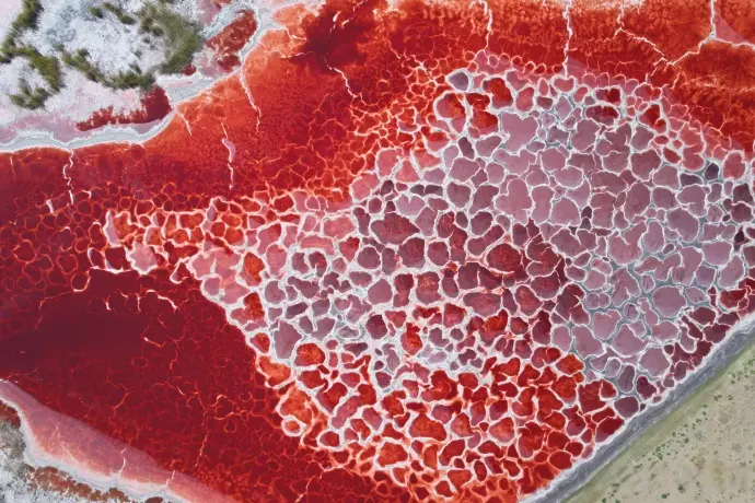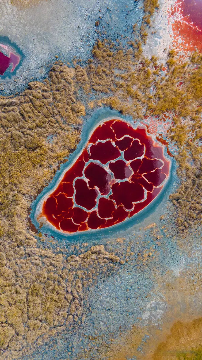 湖底曾经是植被丰富的湖泊湿地,淤积的腐殖质层含有大量有机质,为菌类和微生物的繁殖提供了温床。当这些嗜盐生物富集到一定程度,湖水就会呈现出深红色,如同心脏中充盈的血液。