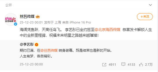 12月23日零点,艺人李艺彤在30岁生日当天发布微博,官宣与丝芭传媒合约期满,将结束双方长达12年的合作关系。一分钟后,丝芭传媒官方火速转发该微博,不仅送上“海阔凭鱼跃,天高任鸟飞”的祝福,还首度披露李艺
