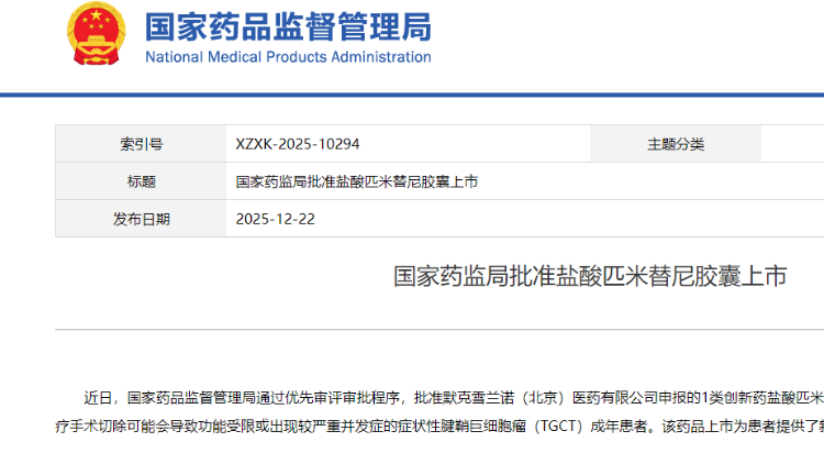 12月22日,默克宣布,其负责商业化的创新药物盐酸匹米替尼胶囊(商品名:贝捷迈)已获中国国家药品监督管理局(NMPA)批准上市。该药用于治疗手术切除可能导致功能受限或严重并发症的症状性腱鞘巨细胞瘤(TGCT)成年患者。作为国内首个也是目前唯一获批用于该适应症的一类创新靶向药,贝捷迈的上市填补了临床治疗空白。