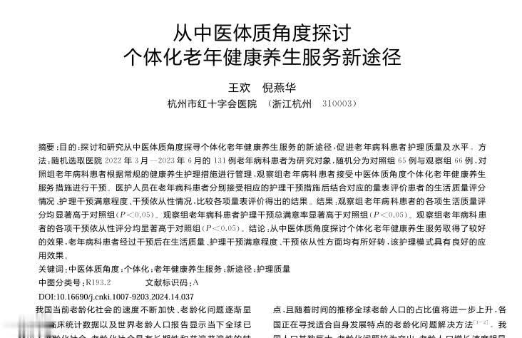[1]王欢,倪燕华.从中医体质角度探讨个体化老年健康养生服务新途径[J].中医药管理杂志,2024-7-28