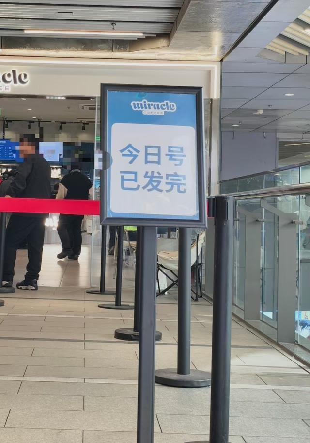 记者上午到达现场的时候,发现没有出现上次开业时一样排队排到楼上的情况,也没有网传的大批人排队,只有店门口有十几位粉丝在排队,其中不少粉丝还是带着凳子和行李箱来的,旁边的牌子上写着:今日号已发完。