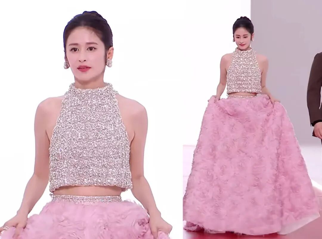 颖儿穿了一套银色上衣和粉色半裙组合起来的两截式礼服,造型很粉嫩。