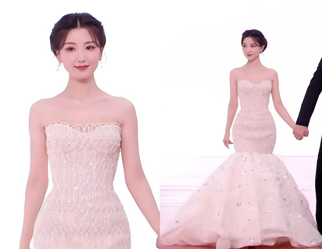 毛晓彤这条缀有亮片的白色鱼尾裙其实也有点像婚纱,跟宋茜比起来,毛晓彤演绎出来的效果就比较像幸福的新娘了。