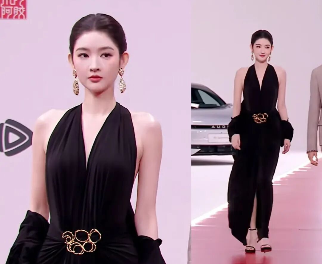 鞠婧祎穿了一条黑色挂脖礼服,秀出了纤细的腰身。不过比起妆发和造型,她的肩膀似乎更瞩目,看起来宽且壮(相对她纤细的腰身来说),但手臂却细得像没有丝毫锻炼痕迹,组合起来就挺违和的。