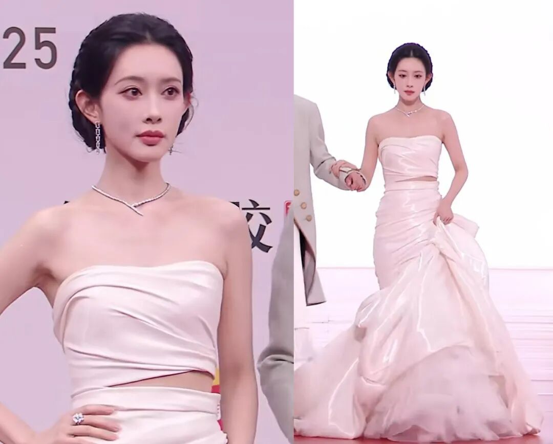 童瑶的妆发温柔大气,就是这条米色纱裙的设计有点看不懂,那两朵立体玫瑰花换个位置会不会没那么奇怪?