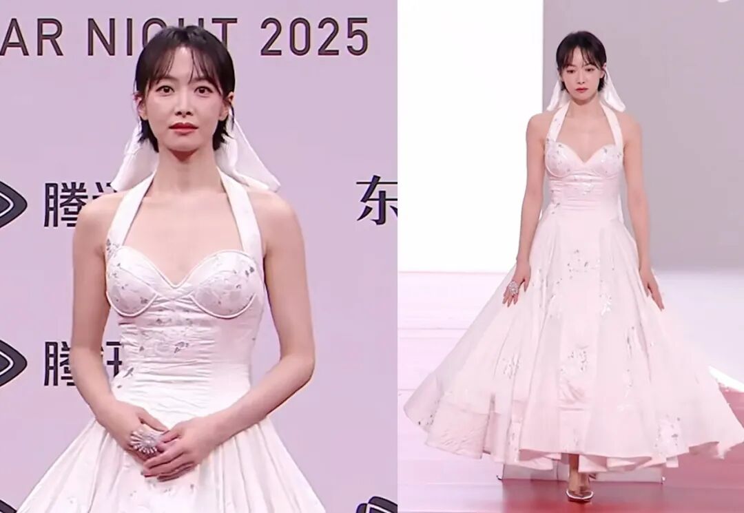 宋茜穿了一件白色挂脖婚纱裙,造型师把原本的头纱换成了白色蝴蝶结拖尾头饰,看起来更契合红毯的场景。只是她拍照时没有露出太多的笑容,宛若一位不太开心的新娘。