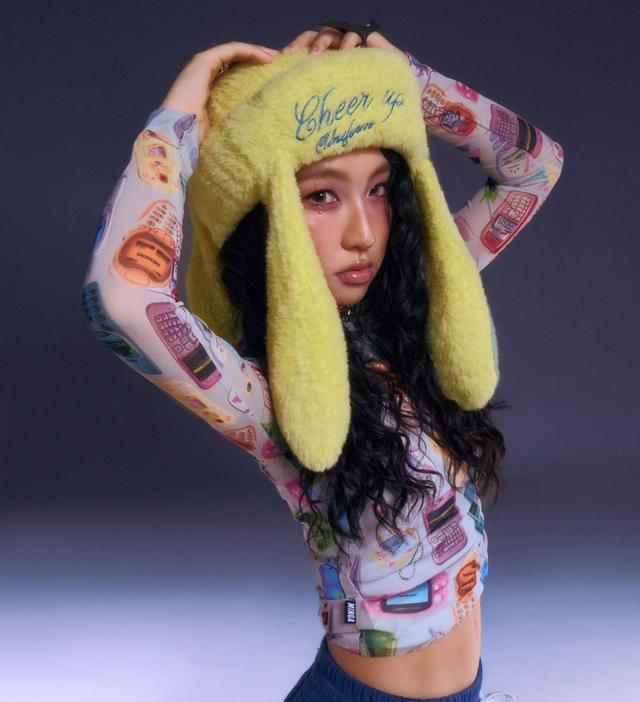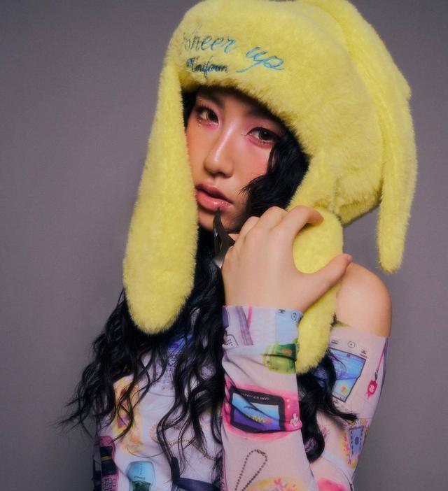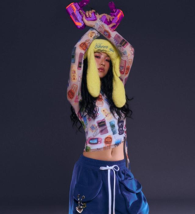 炎明熹在社交平台分享多张造型前卫的照片,她把一头长发电挛,身穿印有怀旧电子产品图案的网纱上衣,搭配蓝色抽绳裤及心形吊饰,头戴鲜黄色毛帽,手持色彩鲜明的玩具枪。整体造型充满千禧年代街头时尚感,与她平日的清纯形象形成强烈对比。最抢眼的是她脚下套上一双狼爪鞋,上身纯情下身凶猛的搭配别具一格,展现出前所未见的坏女孩魅力。