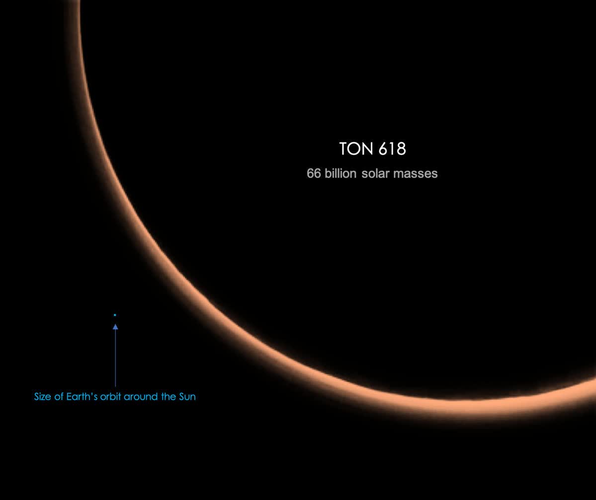 飞行 100 多年后,到达宇宙中最大的TON 618 黑洞,它是一个质量高达 660 亿倍太阳质量的恐怖天体,其强大的引力场能吞噬周围的一切物质,甚至连光都无法逃脱。