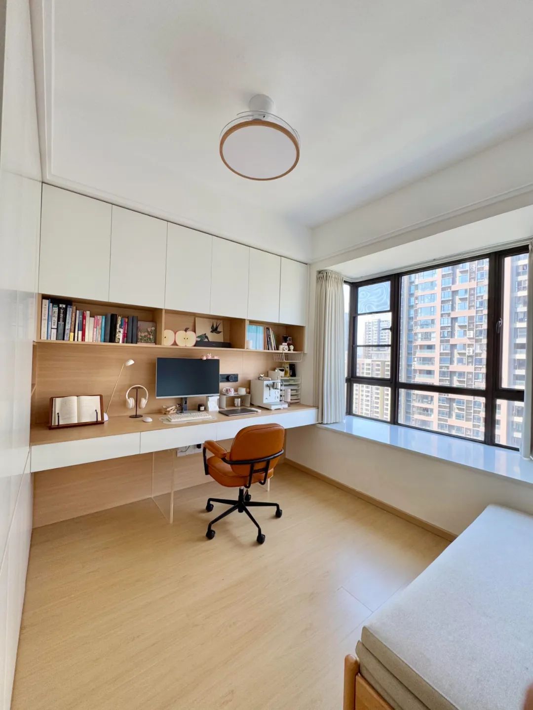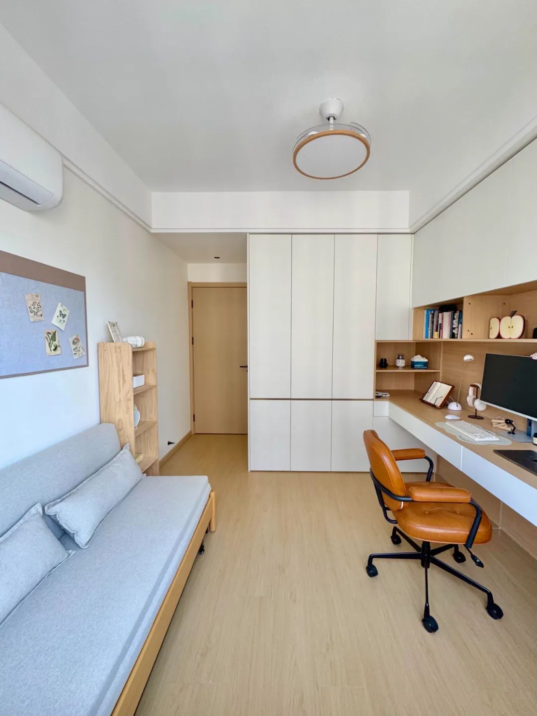 又能布置一个大书桌,用来工作学习,还能安排一个沙发床,有客人来时还能留宿,衣柜、书桌、沙发巧妙地整合在一起,麻雀虽小,五脏俱全,一个房间能顶好几个用。