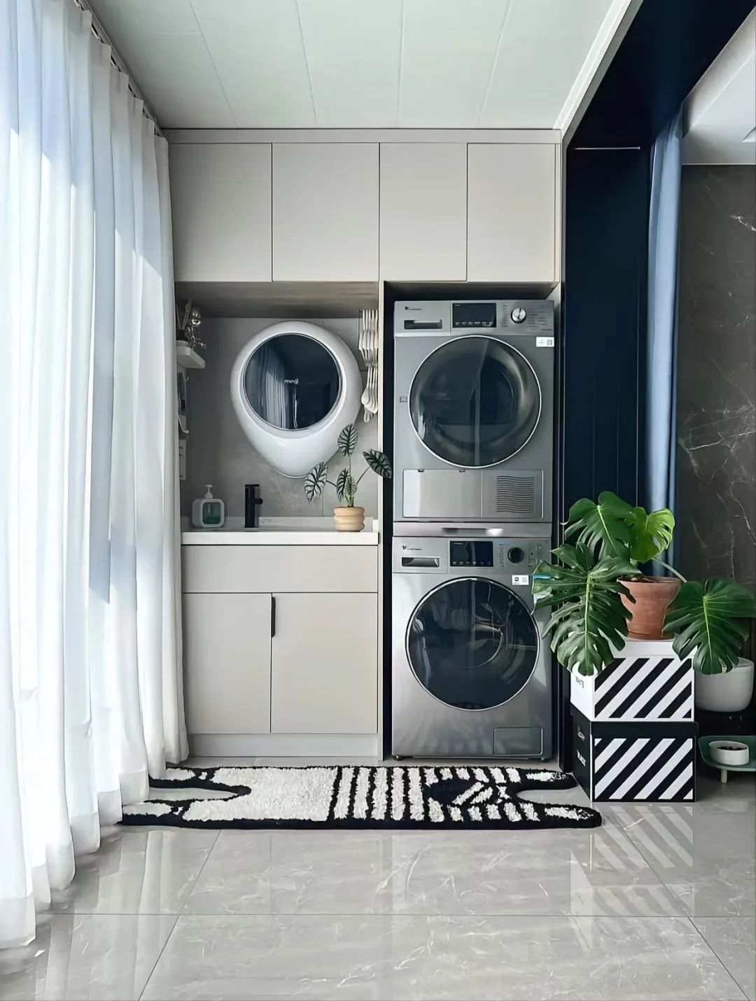 把洗衣机放在阳台,然后做个全铝的洗衣机柜,真是能把小日子过得更顺溜。但洗衣机放阳台必须得有上下水,不然装修时需要硬改。