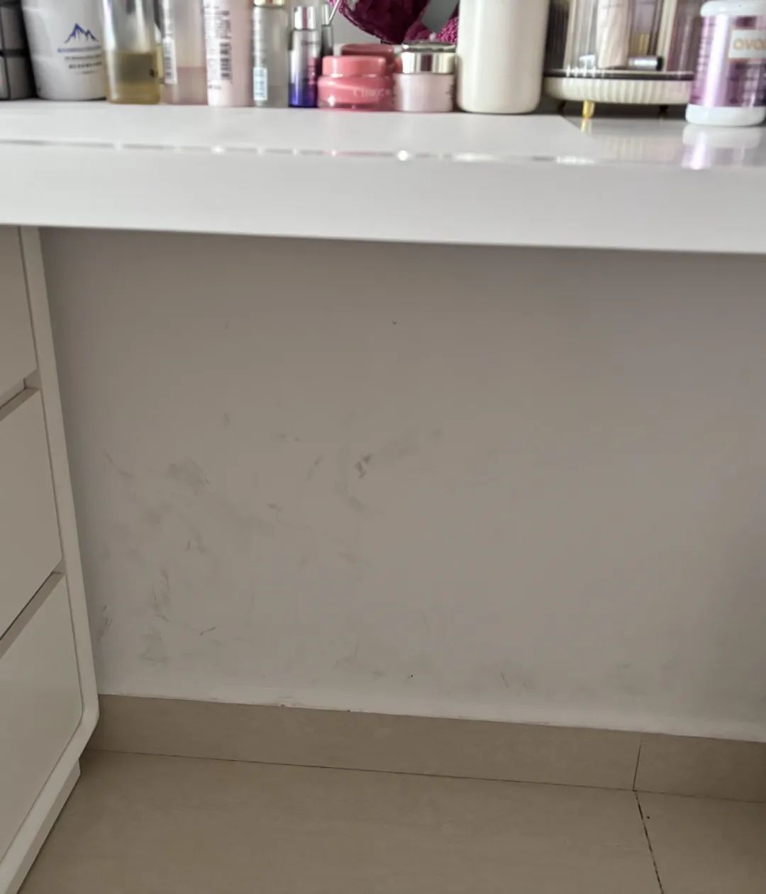 家里的书桌,不管是放在书房还是卧室,大多都是贴着墙放的。可时间一长,就会发现书桌后面的墙面变得惨不忍睹,因为脚会不经意间蹬上去,留下的脚印怎么擦都擦不干净。