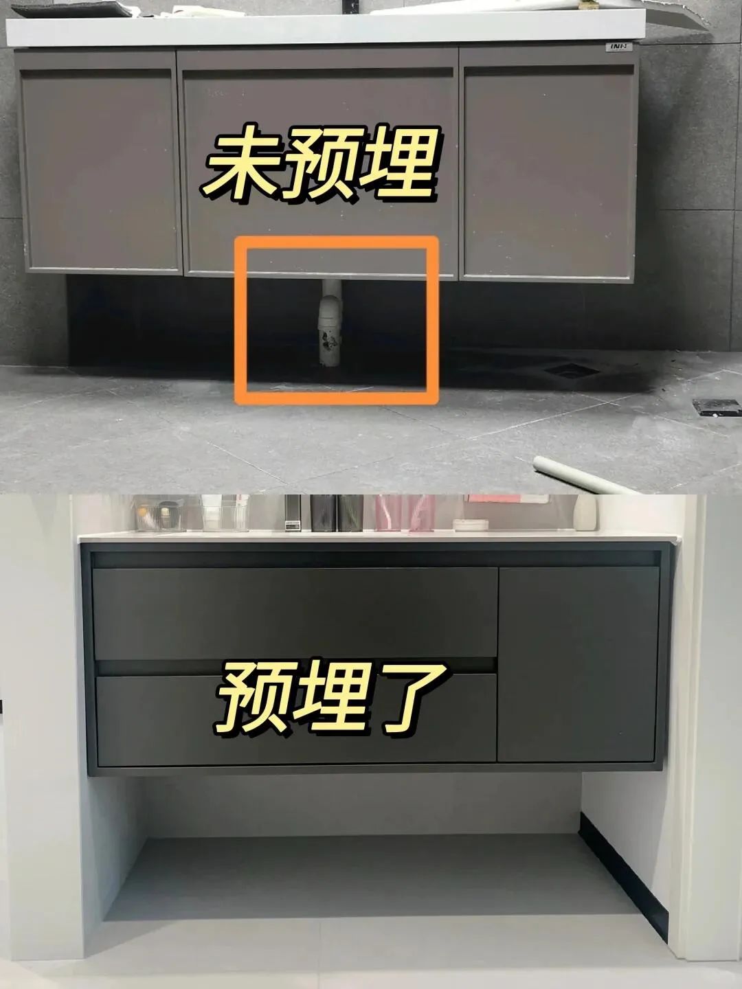 首先好看,管道埋进墙里,再配上悬空的浴室柜,下面没有管子露在外面,显得很清爽。