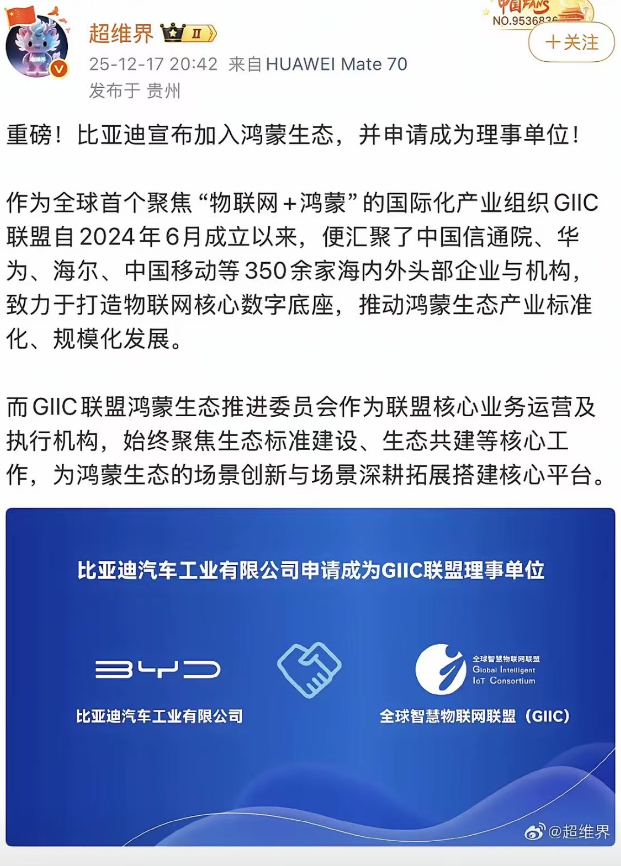 智能出行与居家生活的边界正在被打破!比亚迪汽车工业有限公司近日正式宣布申请加入全球智慧物联网联盟(GIIC),并同步申请成为该联盟理事单位。这一重磅动作,标志着比亚迪与鸿蒙生态的深度融合迈入关键阶段